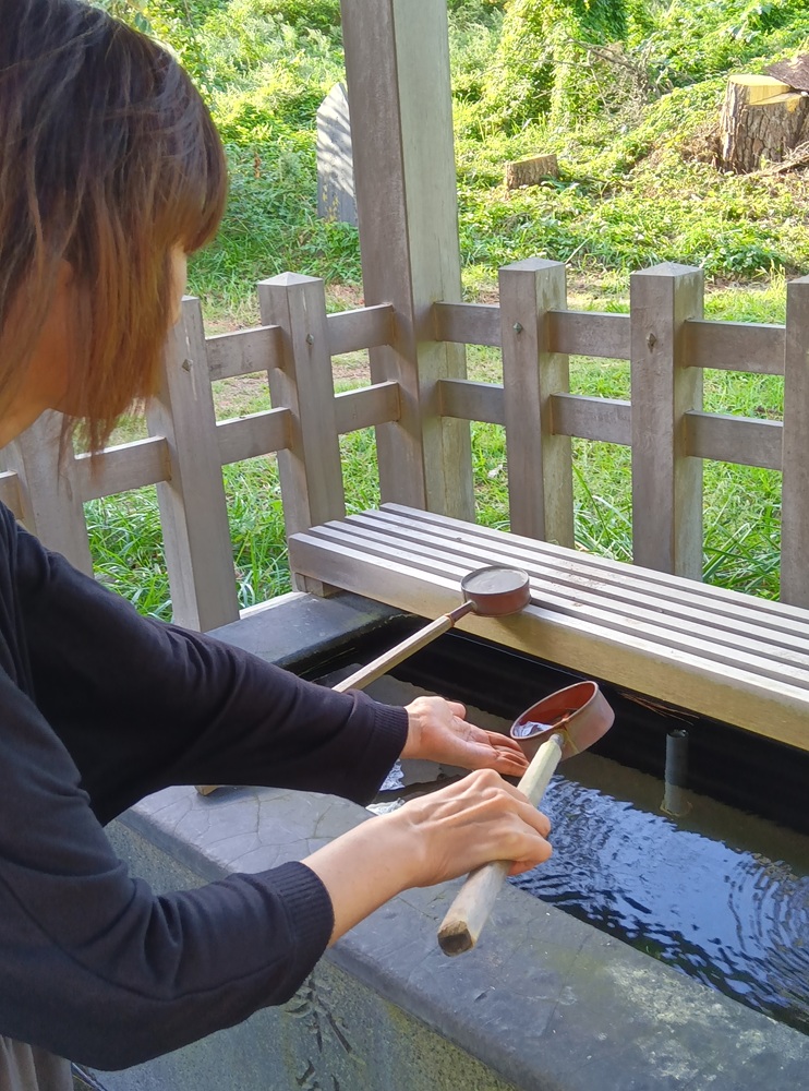 拝殿で拝礼する前に、手水舎で浄めます。